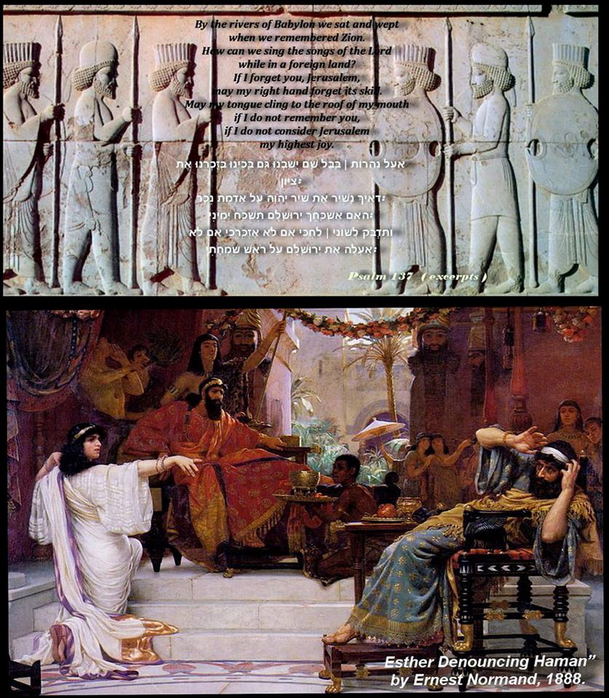 „By the waters of Babylon , we sat and wept…..“ — Diese Zeile ist nicht etwa von Boney M. — mit diesen Worten beginnt vielmehr der Psalm 137 , als Ausdruck für die Unterdrückung und die Not des aus Zion verschleppten jüdischen Volkes im babylonischen ( persischen ) Exil und die Zerstörung seiner heiligen Hauptstadt Jerusalem durch König Nebukadnezar II im 6. Jahrhundert vor der christlichen Zeitrechnung.