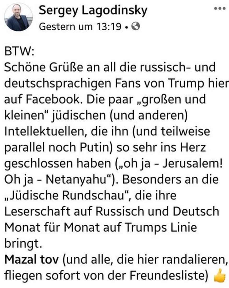 Was sich da auf der Freundesliste dieser Trump-Bashing-Seite Lagodinskys sult, kann der geneigte Leser selbst in Erfahrung bringen. Kein Wunder jedenfalls, dass Kritiker per Ankündigung entfernt werden sollen.