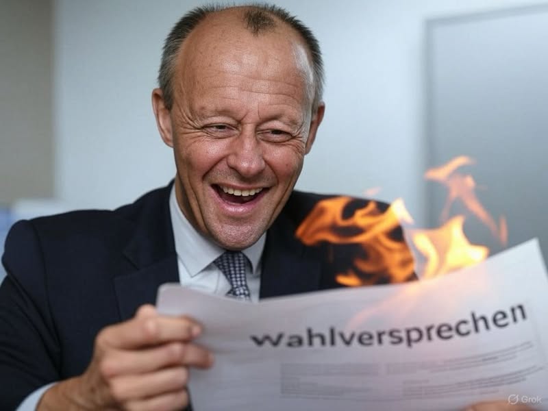 Also wie auch immer — Statt an der Schuldenbremse und an der konservativen Politik festzuhalten, wie er es in salbungsvollen Reden vor der Wahl versprochen hatte, lässt er sich von dem bis auf 16% pulverisierten Wahlverlierer SPD vor sich hertreiben, macht entgegen allen seinen vorgetragenen aber wohl nicht ernst gemeinten Prinzipien voll linke Politik. Er posiert doch tatsächlich anmutig für hübsche harmonische Fotos mit abgewählten politischen Gräßlichkeiten wie Klingbeil und Ensken und schert sich einen Dreck um seine noch vor wenigen Tagen abgebenen Wahlversprechen und er löst die Schuldenbremse nicht nur, sondern ist ein Vorreiter für ein neues x-faches Schuldenmonster, das diese Republik auch noch nicht gesehen hat und das, wenn man alles zusammenzählt die Billionengrenze übeschreiten wird.